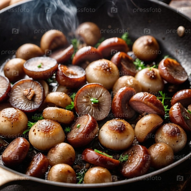 Вкусные жареные грибы в сковороде готовят на среднем огне, испуская пар в уютной обстановке кухни во второй половине дня. Свежесобранные грибы шипят в горячей сковороде, выпуская пар. ИИ