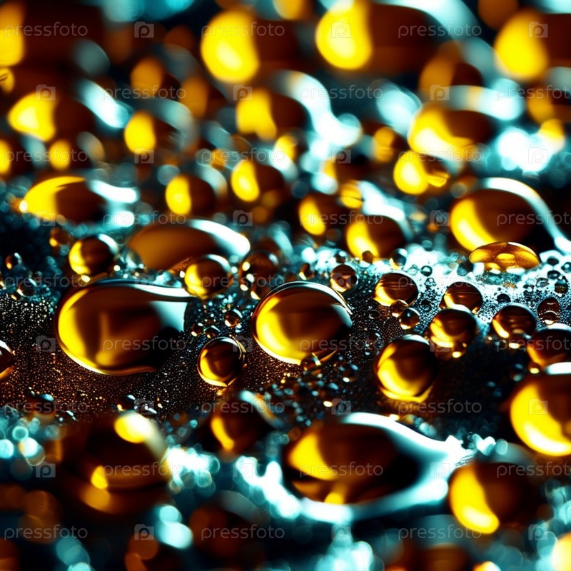 Золотые капли масла мерцают на гладкой отражающей поверхности, их яркий цвет и сферические формы создают очаровательный визуальный дисплей при нежном освещении