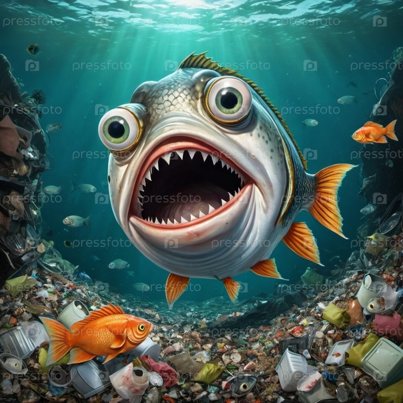Большая рыба с преувеличенными выпуклыми глазами реагирует в ужасе, когда она плавает через загрязненную область, заполненную выброшенным мусором, демонстрируя последствия загрязнения воды. Рыба с открытым ртом. Искусство