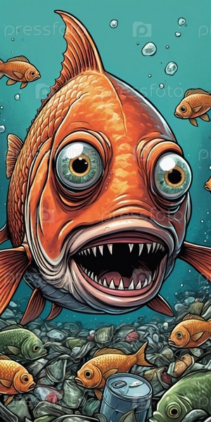 Большая рыба с преувеличенными выпуклыми глазами реагирует в ужасе, когда она плавает через загрязненную область, заполненную выброшенным мусором, демонстрируя последствия загрязнения воды. Рыба с открытым ртом. Искусство