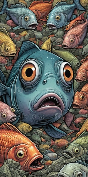 Большая рыба с преувеличенными выпуклыми глазами реагирует в ужасе, когда она плавает через загрязненную область, заполненную выброшенным мусором, демонстрируя последствия загрязнения воды. Рыба с открытым ртом. Искусство