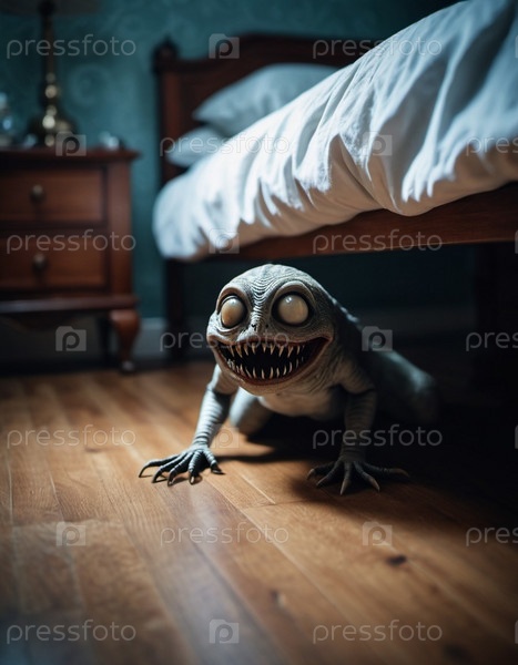 Ужасающее кошмарное существо, скрывающееся под кроватью в тускло освещенной спальне, захватывает сущность страха и неизвестности ночью. Гротескное существо с привидениями тихо появляется из-под кровати. ИИ