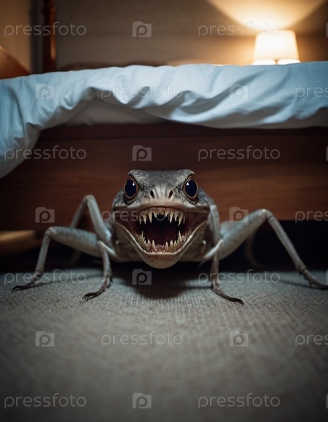 Ужасающее кошмарное существо, скрывающееся под кроватью в тускло освещенной спальне, захватывает сущность страха и неизвестности ночью. Гротескное существо с привидениями тихо появляется из-под кровати. ИИ