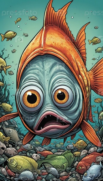 Большая рыба с преувеличенными выпуклыми глазами реагирует в ужасе, когда она плавает через загрязненную область, заполненную выброшенным мусором, демонстрируя последствия загрязнения воды. Рыба с открытым ртом. Искусство