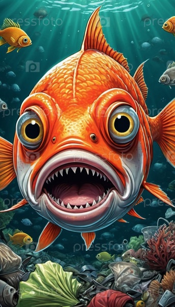 Большая рыба с преувеличенными выпуклыми глазами реагирует в ужасе, когда она плавает через загрязненную область, заполненную выброшенным мусором, демонстрируя последствия загрязнения воды. Рыба с открытым ртом. Искусство
