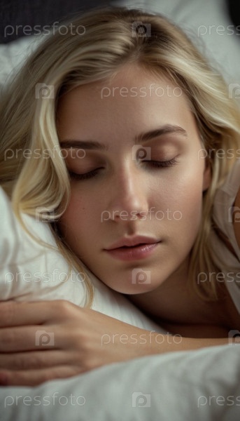 Мирная блондинка крепко спит в уютной постели, окруженная мягкими подушками и безмятежной ночной атмосферой. Генеративный ИИ. Молодая блондинка спокойно спит в постели, наслаждаясь спокойным моментом