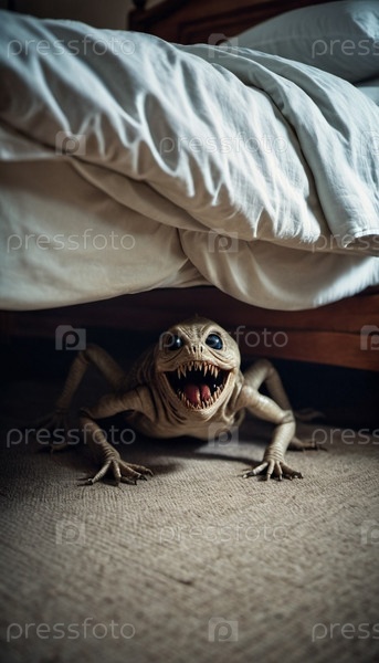 Ужасающее кошмарное существо, скрывающееся под кроватью в тускло освещенной спальне, захватывает сущность страха и неизвестности ночью. Гротескное существо с привидениями тихо появляется из-под кровати. ИИ