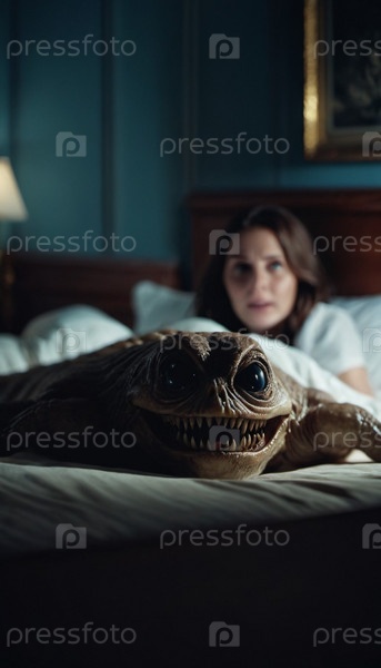 Ужасающее кошмарное существо, скрывающееся под кроватью в тускло освещенной спальне, захватывает сущность страха и неизвестности ночью. Гротескное существо с привидениями тихо появляется из-под кровати. ИИ