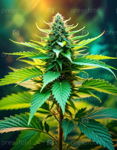 Растение марихуаны в полном расцвете. Листья яркие зеленые. Описание роста и развития растений. Медицинская марихуана. Использование каннабиноидов для лечения заболеваний или облегчения симптомов. ИИ