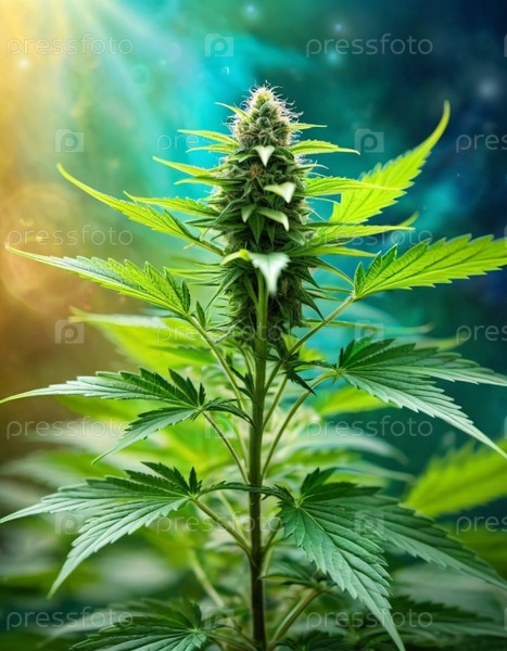 Растение марихуаны в полном расцвете. Листья яркие зеленые. Описание роста и развития растений. ИИ