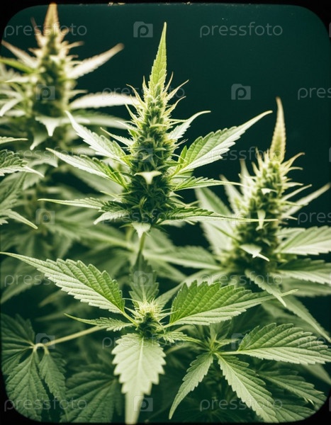 Растение марихуаны в полном расцвете. Листья яркие зеленые. Описание роста и развития растений. ИИ