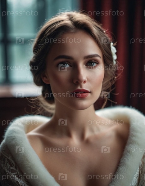 Потрясающий портрет молодой россиянки с пленительными глазами мягкого макияжа, запечатленный во время безмятежной вечерней прогулки. Красивый вырез и вечерняя прическа на длинных волосах. Формальное или романтическое событие. ИИ
