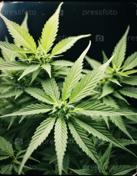 Растение марихуаны в полном расцвете. Листья яркие зеленые. Описание роста и развития растений. ИИ