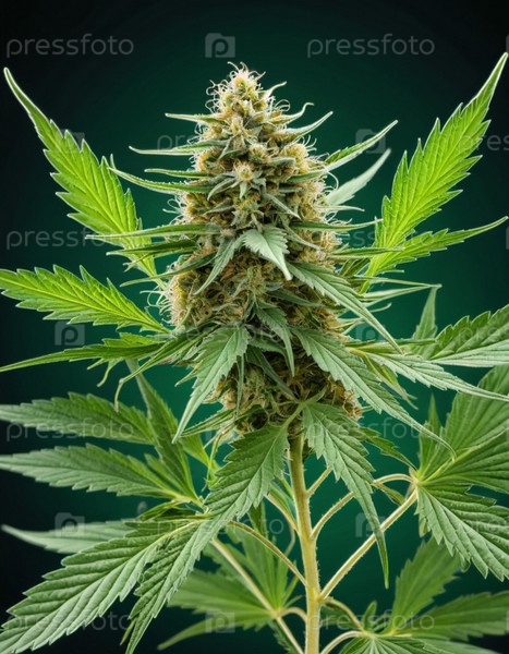 Растение марихуаны в полном расцвете. Листья яркие зеленые. Описание роста и развития растений. ИИ