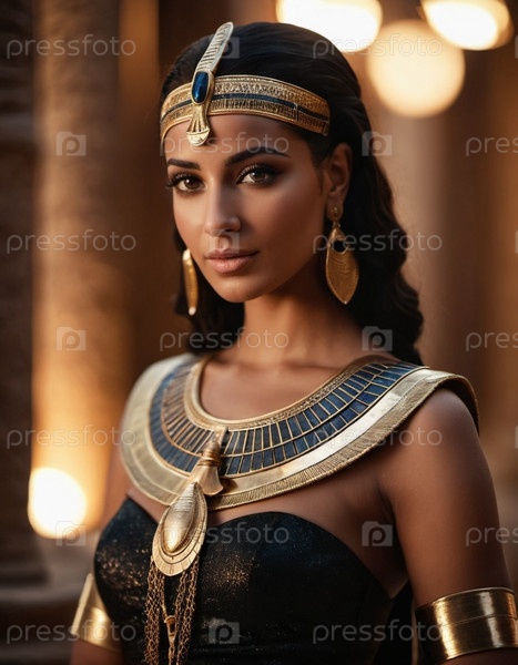 Элегантная египетская женщина, украшенная традиционными украшениями, стоит изящно. Искусство. Поразительная египетская красота очаровывает традиционной одеждой, окруженной светящимися огнями в величественной дворцовой среде