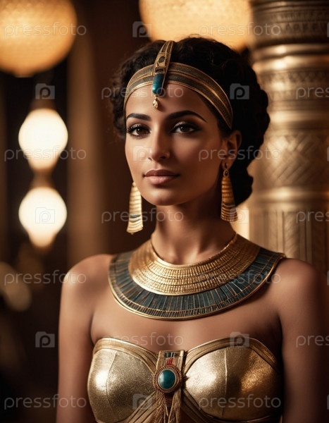 Элегантная египетская женщина, украшенная традиционными украшениями, стоит изящно. Искусство. Поразительная египетская красота очаровывает традиционной одеждой, окруженной светящимися огнями в величественной дворцовой среде