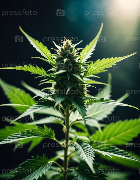 Растение марихуаны в полном расцвете. Листья яркие зеленые. Описание роста и развития растений. ИИ