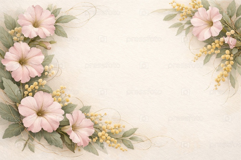 Поздравительная открытка к 8 марта с петуньей и мимозой