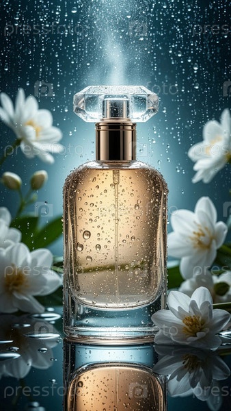 Флакон с духами на темном фоне с цветами. Один флакон с парфюмом на фоне с каплями конденсата и аромата. Бутылочка с духами, туалетной водой или одеколоном. Духи для рекламы