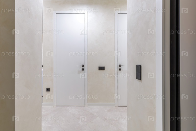 Фронтальный вид современного коридора с двумя белыми дверями с гладкими черными ручками. Интерьер включает светлые бежевые текстурированные стены, серые напольные плитки и минималистские черные выключатели света. Чистые архитектурные линии в новой квартир