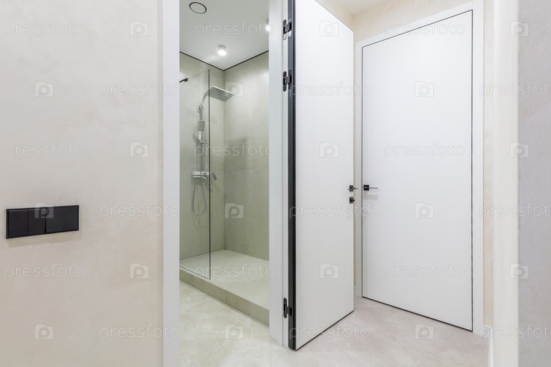 Вид на минималистский коридор с открытыми белыми дверями и взглядом на современную ванную комнату. Ванная комната включает в себя стеклянную перегородку для душа и серые черепичные стены. Чистый дизайн интерьера с черными переключателями и оборудованием