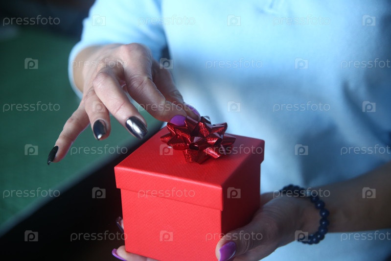 Красная подарочная коробка с сюрпризом в женской руке. Международный женский день