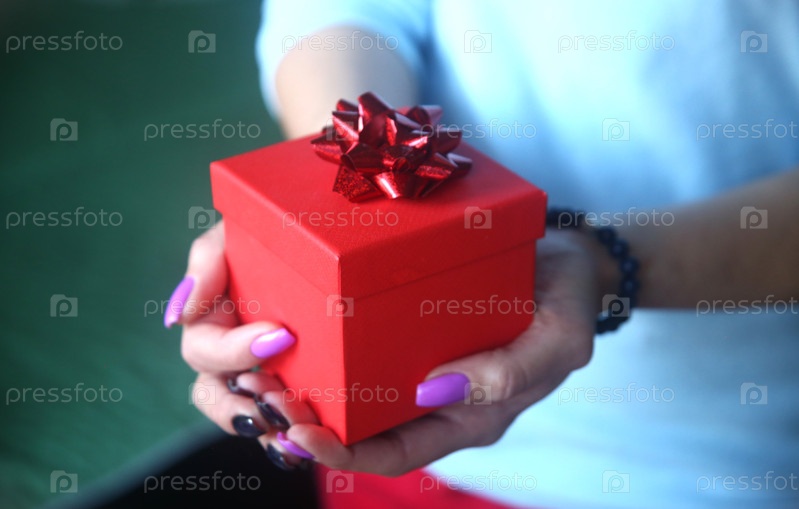 Красная подарочная коробка с сюрпризом в женской руке. Женщина радуется подарку. Международный женский день