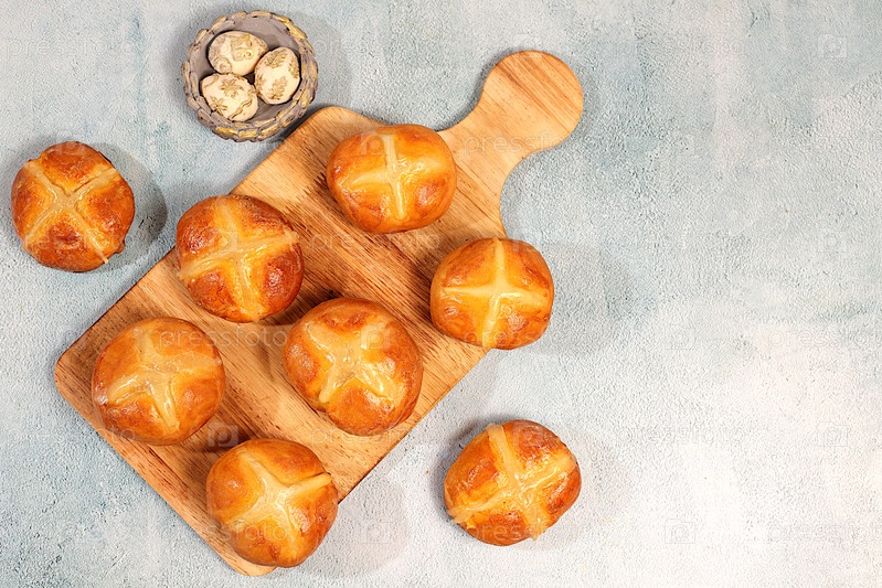 Концепция счастливой Пасхи. Пасхальные булочки с крестом на бетонном столе. Английские булочки пекут в пятницу и подают с чаем утром перед Пасхальным воскресеньем. Праздничный пасхальный праздник,