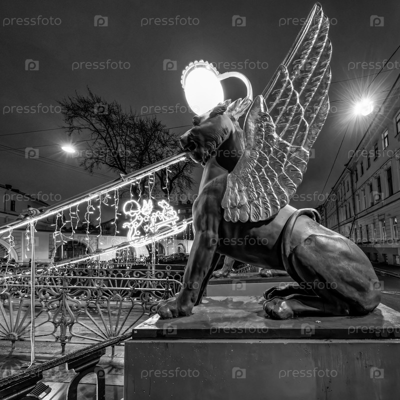 Крылатый лев (грифон) Банковского моста. Санкт-Петербург. Черно-белое изображение. ОКНФЗ 781710784870036