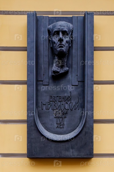 Мемориальная доска Евгению Мравинскому, 1992 год. Архитектор Вера Васильевна Исаева, скульптор Левон Константинович Лазарев. Санкт-Петербург, Михайловская улица, дом 2 (Итальянская улица, дом 9)