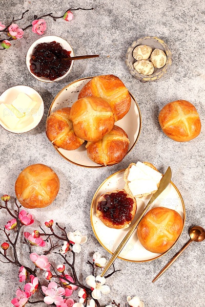 Концепция счастливой Пасхи. Пасхальные булочки с крестом и вареньем, маслом и цветами вишни. Английские булочки пекут в пятницу и подают с чаем утром перед Пасхальным воскресеньем. Праздничный пасхальный праздник