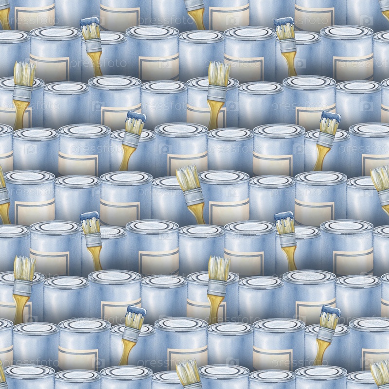 Бесшовный рисунок из банок краски и кистей. Акварельная иллюстрация рабочих инструментов художника. Горизонтальный реалистичный фон для проектирования ремонтных и строительных предприятий