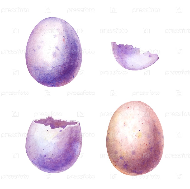 Набор цветных окрашенных яиц на изолированном фоне. Акварельная иллюстрация цельных и разбитых яиц. Пасхальные розовые и фиолетовые яйца украшают пасхальный праздник