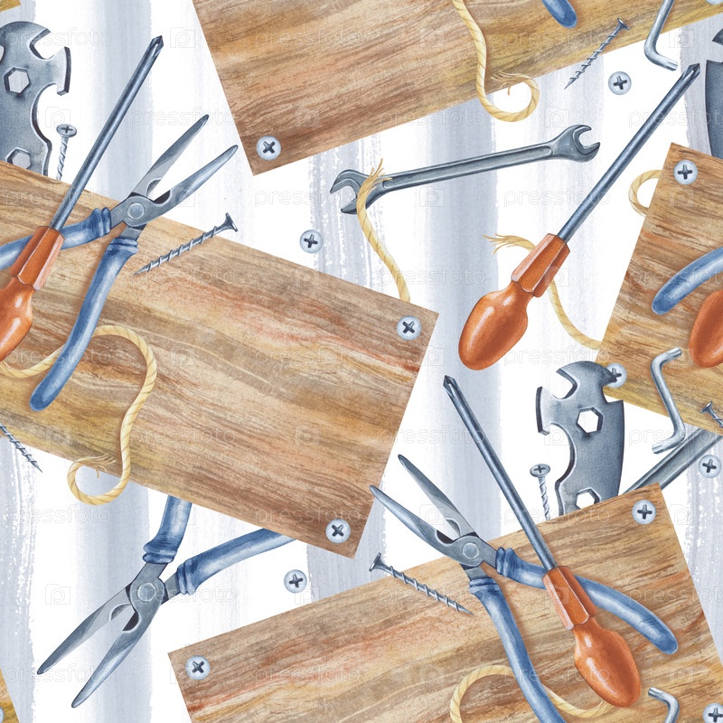 Бесшовный узор с рабочими инструментами и деревянной доской на фоне серых полос краски. Изолированная акварельная иллюстрация мужских рабочих инструментов для ремонта дома. Реалистичный повторяющийся шаблон для упаковки и печати