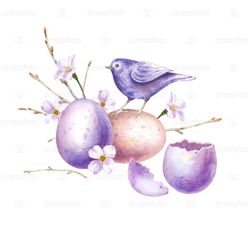 Весенняя композиция с маленькой птицей, расписными яйцами, голыми ветвями деревьев и белыми цветами. Акварельная иллюстрация на изолированном фоне. Нежный клипарт для украшения пасхальных и весенних тем