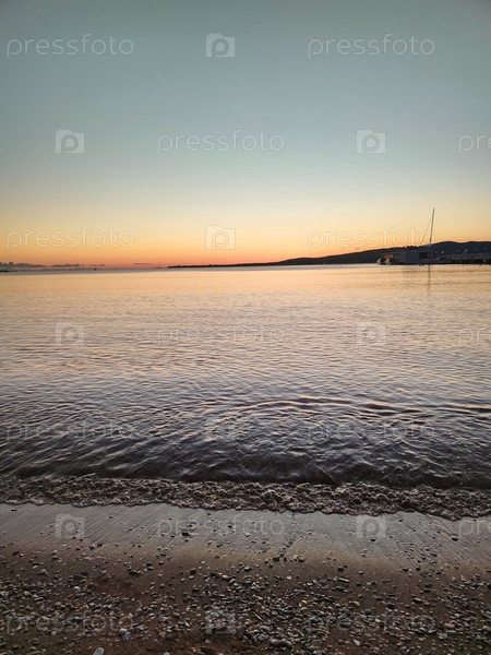 Пляж на закате со спокойным морем и городскими огнями, вечерний фон, прибрежные обои