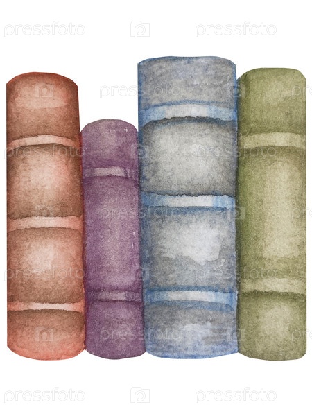Нарисованный вручную акварельный набор иллюстраций различных книг, деревянная книжная полка, полная книг, стопка книг, свитки и бумага. Яркая иллюстрация для оформления книжного магазина или библиотеки, обложка, пакет, карточка