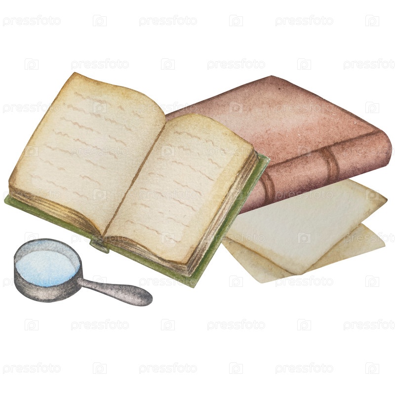 Нарисованный вручную акварельный набор иллюстраций различных книг, деревянная книжная полка, полная книг, стопка книг, свитки и бумага. Яркая иллюстрация для оформления книжного магазина или библиотеки, обложка, пакет, карточка