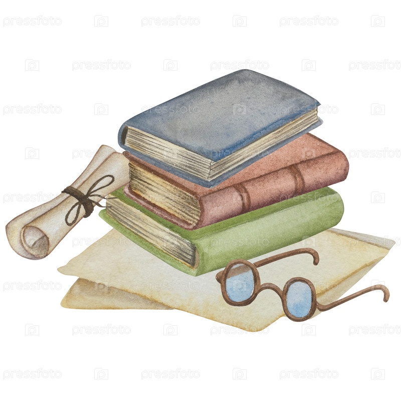 Нарисованный вручную акварельный набор иллюстраций различных книг, деревянная книжная полка, полная книг, стопка книг, свитки и бумага. Яркая иллюстрация для оформления книжного магазина или библиотеки, обложка, пакет, карточка