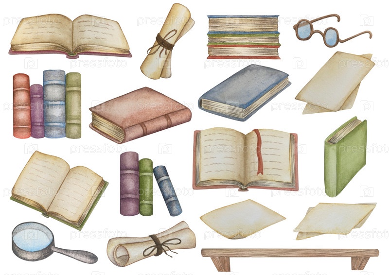 Нарисованный вручную акварельный набор иллюстраций различных книг, деревянная книжная полка, полная книг, стопка книг, свитки и бумага. Яркая иллюстрация для оформления книжного магазина или библиотеки, обложка, пакет, карточка