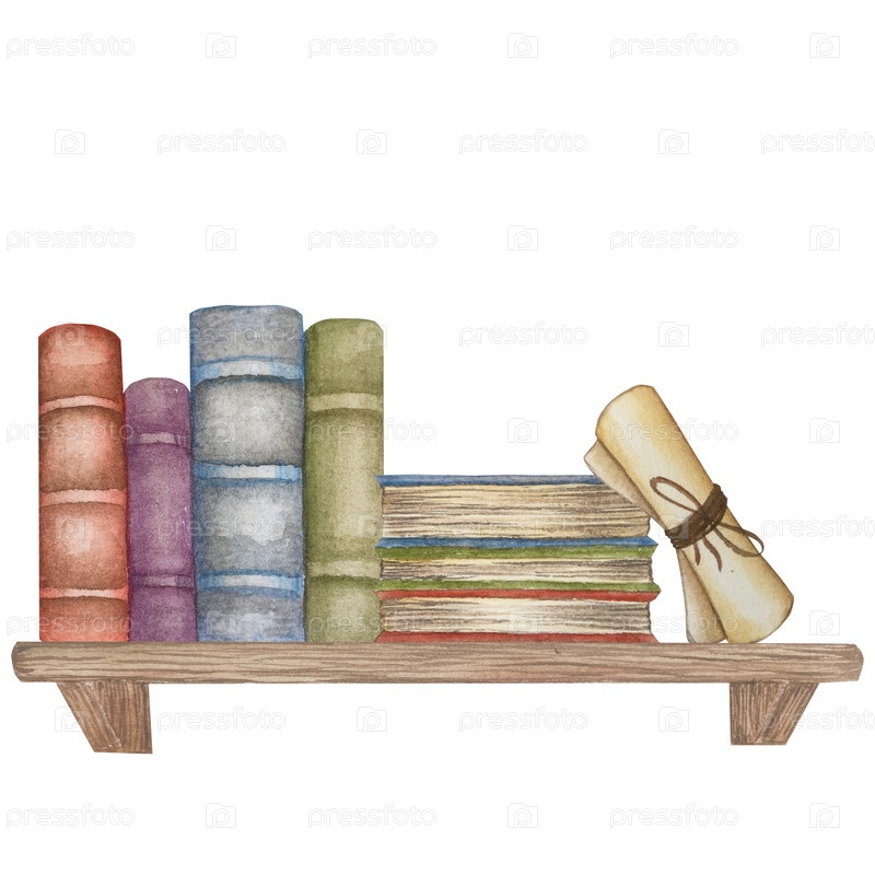 Нарисованный вручную акварельный набор иллюстраций различных книг, деревянная книжная полка, полная книг, стопка книг, свитки и бумага. Яркая иллюстрация для оформления книжного магазина или библиотеки, обложка, пакет, карточка