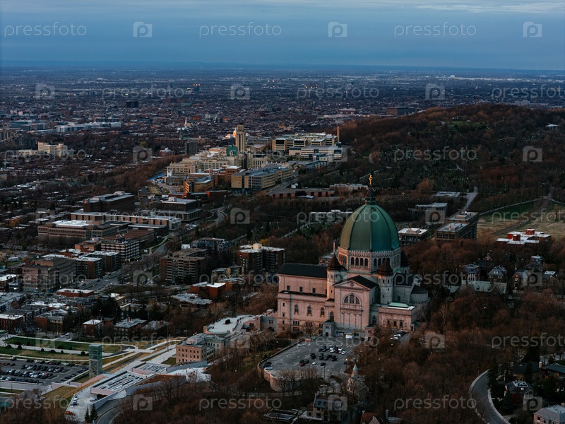 Вид с воздуха на Ораторию Святого Иосифа на горе Роял на закате летом. Монреаль, Квебек, Канада