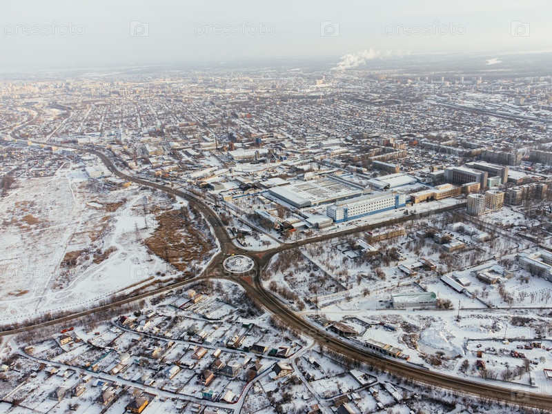 Снежная воздушная панорама города Уральска в Казахстане с жилыми и промышленными зонами. c