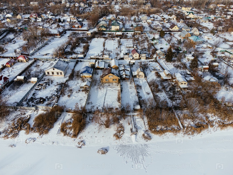 Вид с воздуха на заснеженные дома возле замерзшей реки в Уральске, Казахстан, зимой. c