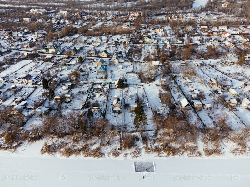 Вид с воздуха на заснеженные дома возле замерзшей реки в Уральске, Казахстан, зимой. c