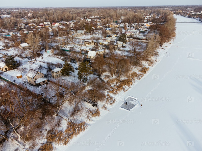Вид с воздуха на заснеженные дома возле замерзшей реки в Уральске, Казахстан, зимой. c