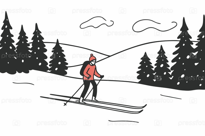 Кросс-кантри лыжник скользит по склонам в лесу