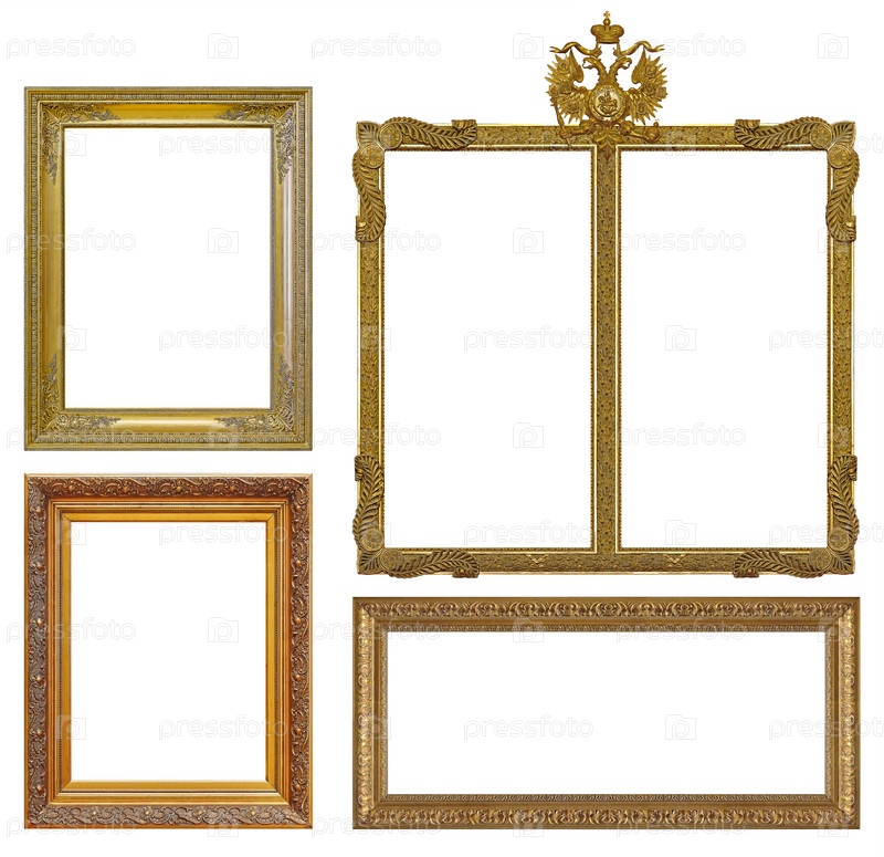 Набор золотых рамок для картин, зеркал или фотографий, изолированных на белом фоне