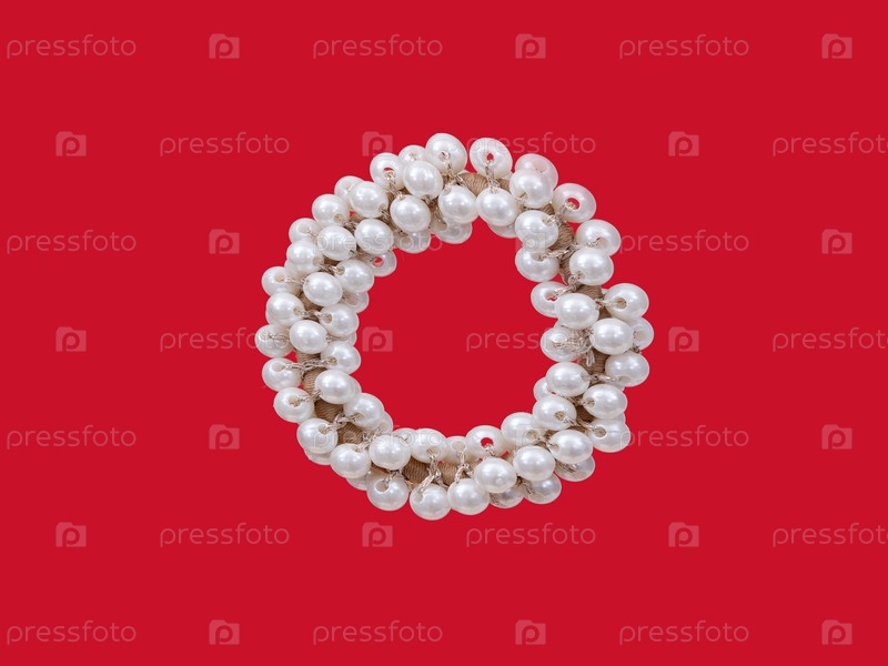 Элегантный круговой венок из жемчуга и текстильной нити, изолированный на красном фоне, вырез готов. Чрезвычайно высокое разрешение