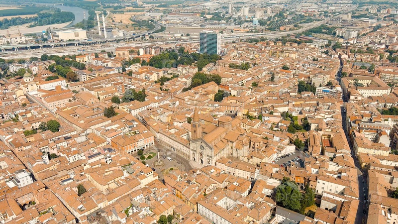 Пьяченца, Италия. Кафедральный собор Пьяченцы. Епископский дворец. Исторический центр города. Летний день, Aerial View